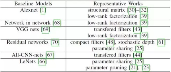 表 4. 模型压缩不同的代表性研究中使用的基线模型。