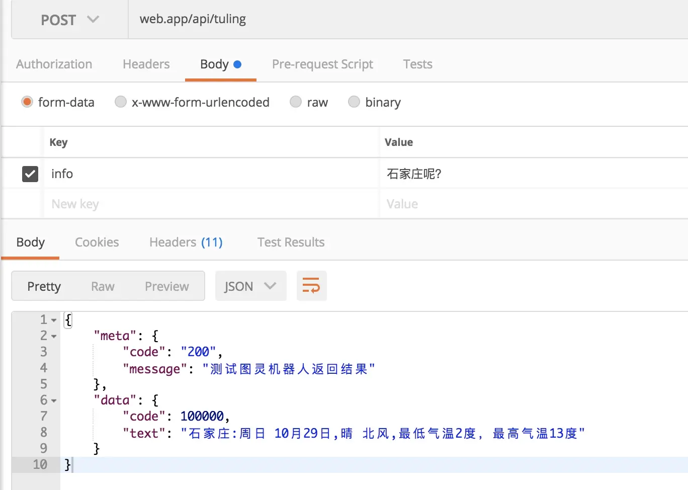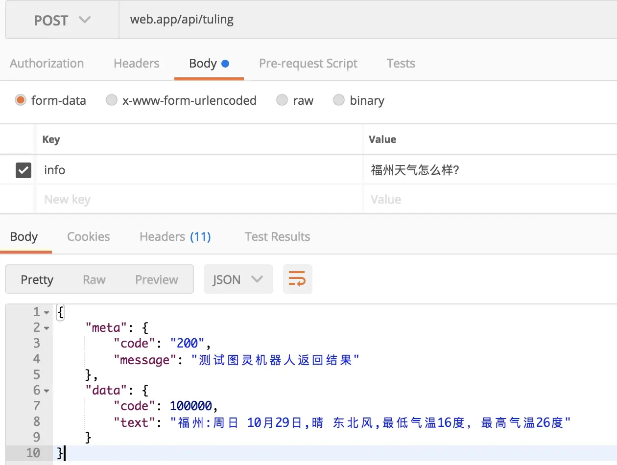 访问第三方接口,基本上都是 POST 请求为主。如你想做一个简单的智能聊天工具,这时候可以借助图灵机器人 API,发送一个 POST 请求获取自动回答内容,直接上代码: