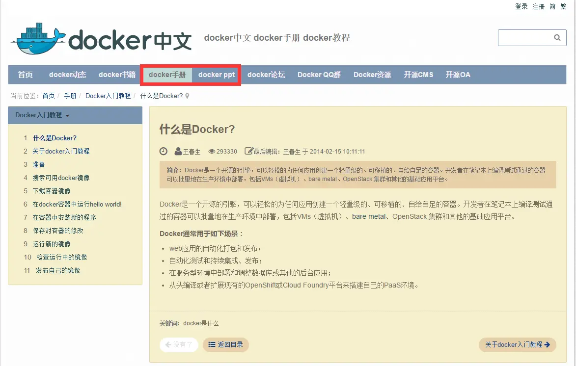 网站上的【Docker手册】以及【Docker ppt】两个栏目有 Docker 教程,可以学习到 Docker,对于想入门 Docker 的小伙伴来说是个可以看看入门教程,不过都比较简单。