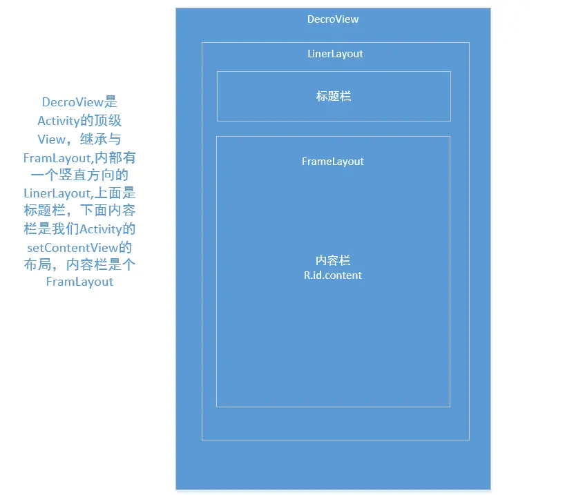 为了更好理解这两种情况,我们复习一下DecroView,DecroView是Activity的顶级View,继承与FramLayout,内部有一个竖直方向的LinerLayout,上面是标题栏,下面内容栏,内容栏是我们Activity的setContentView的布局,这个内容栏是个FramLayout。