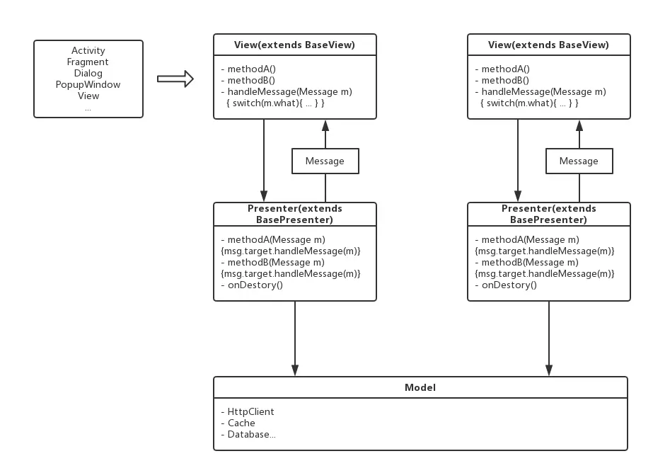 2、MVPArt:一个新的 MVP 架构,此框架旨在解决传统 MVP 类和接口太多、并且 Presenter 和 View 通过接口通信过于繁琐、重用 Presenter 代价太大等问题。架构图如下: