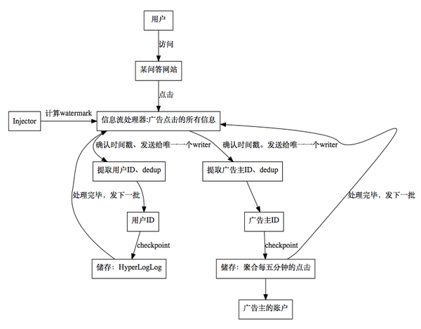 数据处理作为一个整体可以根据用户提供的DAG(无回路图)来决定这些事件流的内容被如何处理,这样用户可以叠加各种各样的计算方式。比如我在一个不知名高逼格问答网站上面点击了一个广告,这个点击可以根据广告id,广告主id,用户id来做聚合,但是处理逻辑是分开的,但是都可以在MillWheel的框架下面执行。