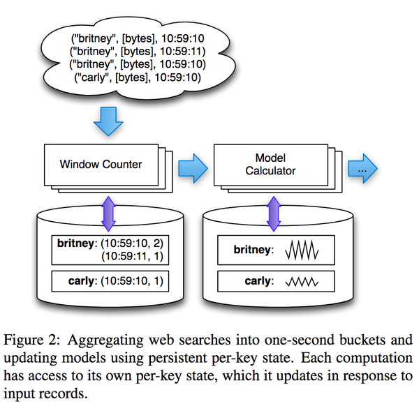 Google在2013年发了一篇非常重要的paper,来教大家Google是如何在stream processing (事件流处理)方面做到exactly once semantic的,叫MillWheel。这个实现并不是最早做到exactly once的(可能trident会稍微早一点),但是这里面通过low watermark和per key storage这两个概念来做绝对是创新。原文在这里:https://static.googleusercontent.com/media/research.google.com/en//pubs/archive/41378.pdf
