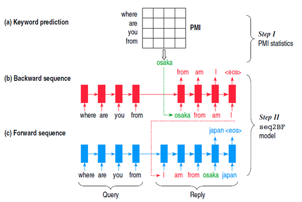 从图中可以看出,这一模型具有三个模块。第一个模块是关键词预测模块,作者使用PMI这一共现频率作为关键词选择的依据。PMI是在整个数据集上计算得到的每个词和一些关键词的共现频率。通过这种方法,给定一个上文时,就可以得到与其最相关的关键词了。与之前的模型不同,该模型希望显式的控制生成,保证关键词出现在回复中。背后的想法是很直观的,只要保证了该关键词一定在回复中出现,该回复的信息量就得到了保证。具体的做法是,分两步生成回复,先以该关键词为首词反向生成该关键词之前的一些词,再将这生成的半个句子,倒过来送入另一个模型中,继续生成后续的词,最终得到一个完整的句子。实验表明,这种方法生成的句子内容的丰富度得到了提高。这种方法与上述的引入主题的方法形成了一个很好的对比,一个是通过隐式的引入主题词控制生成的内容,一个通过显式的加入关键词来控制生成的回复,两种方法都取得了很好的效果。