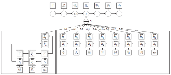 如果抛开左边意向部分不看,左边即是Seq2seq+Attention模型,而左边恰好是意向引入的模块,其使用了一个单独的RNN序列将意向进行编码,得到的结果与上一句诗一起通过Attention机制进行生成。当然,第一句诗的生成只使用了左边意向部分的编码。这样生成得到的诗在韵律、流畅度、语义等方面都有一定的保证,取得了很好的结果。