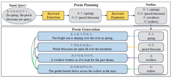 可以看到,整个模型分为两大部分,第一部分是规划模块,在用户输入了一个句子后,先对该句子进行意向的抽取,如果意向不足则对该主题的意向进行扩充,从而得到指定数量的意向作为之后生成句子的依据。如图可以看到,由“春天的桃花开了”最终可以获得四个相关意向:春天、桃花、燕、柳。之后生成部分的模型如下: