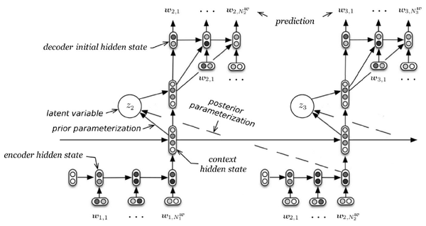 这一模型与HRED模型相比,多了一个隐式变量的部分,这一个模块背后的含义非常复杂,与VAE(变分自动编码器)的核心思想类似。这里笔者对VAE了解的还不够深入,无法很好的描述其工作机理,遂不进行详细描述。总而言之,利用该隐式变量,模型能够更好的刻画上下文信息,从而生成出内容更连贯的回复。