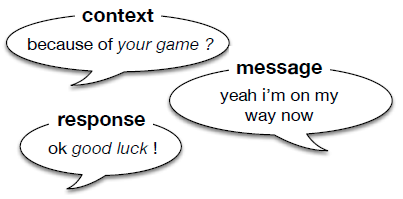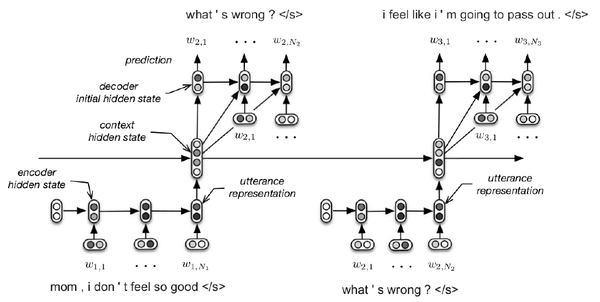 该模型与上文模型所解决的问题以及使用的数据集的构造都有所不同。该模型试图解决在给定一个上下文信息的情况下,对话的生成问题,所以其使用的数据集是三元组的形式,包含一个上下文,一个信息,以及一个回复。