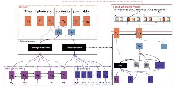 与之前提到的Seq2seq+Attention相比,作者引入了新的Topic Attention来强化主题的作用。从图中可以看到,这一Attention是作用在Topic Words上的。而这些Topic Words则是使用Twitter-LDA[8]训练得到的。通过预训练主题模型,能够得到每个上文对应的主题信息,以及包含的一定数量的主题词。在进行回复生成时,同时考虑主题词的作用,从而使生成的回复更加有趣,内容更加丰富。此外,右侧部分可以看到,作者对Decoder端生成词的概率进行了一定调整,这里的想法是,我们自然的认为生成的句子中这些主题词出现的概率应当大一些,正如图中所示,上文在说自己皮肤干燥的问题,主题词是一些皮肤、干燥、脸等相关词汇,当这些词汇出现在回复中时,既与上文息息相关,又增加了回复的信息量,所以对这些词进行概率加成会取得一定的效果。实验结果表明,这种在Encoder端和Decoder端同时考虑主题词的方法能够生成更加有趣、更有具有内容的回复。