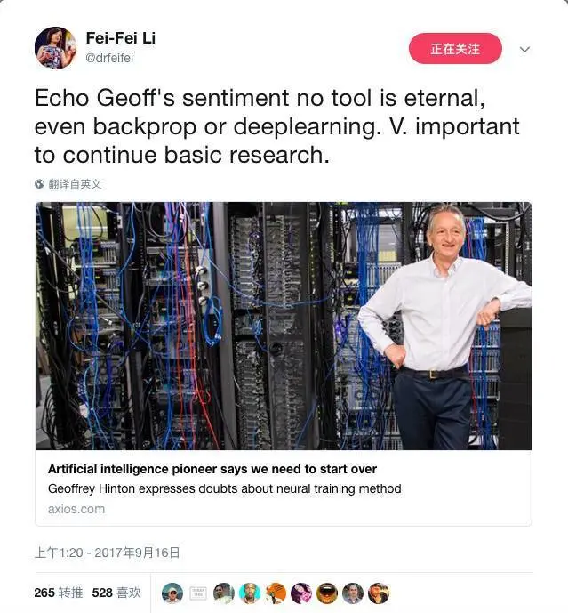 这当然是苦力活,Hinton大神亲自操刀的话,成功了会毁掉自己赖以成名的反向传播算法和深度学习理论,失败了则将重蹈爱因斯坦晚年“宇宙常数”的覆辙。所以,李飞飞对他在这里的勇气大为赞赏: