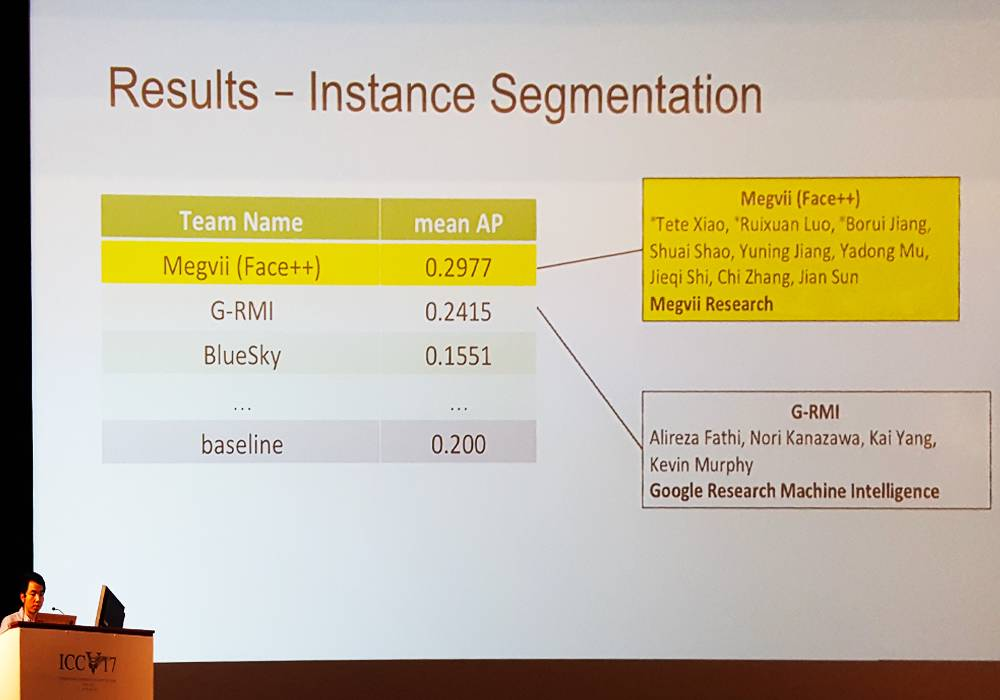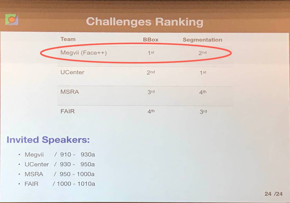 当地时间10月29日上午,在意大利威尼斯召开的计算机视觉国际顶级会议 International Conference on Computer Vision(ICCV 2017)的 “Joint COCO and Places Recognition Challenge” Workshop 中公布了 COCO 及 Places 竞赛排名情况。在共七项挑战项目中,旷视科技研究院团队(Megvii)参与了其中最重要的四项,并获得了三项第一、一项第二的优异成绩,一举击败了来自微软、Facebook、Google、商汤科技等企业,以及卡内基梅隆大学、北京大学、香港中文大学、上海交通大学等高校的竞争者,成为了第一个在 COCO 竞赛中获得冠军的中国企业。
