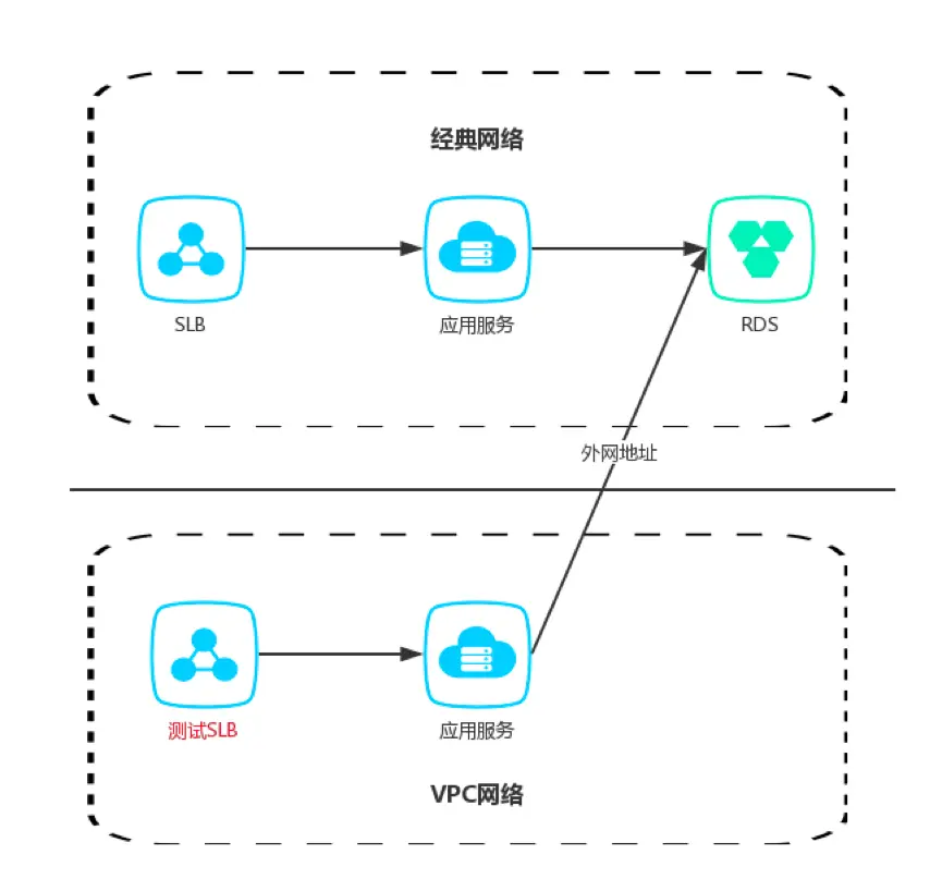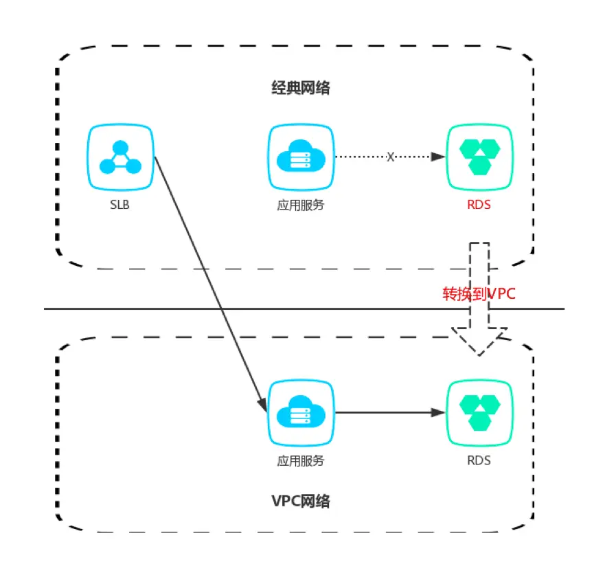 VPC提前部署服务测试,通过公网连接经典网络RDS,在迁移完成后,RDS“一键切换为VPC网络”。数据网络切换为VPC后,需要修改工程代码指向VPC内网地址,并重新发布部署,工作非常繁杂,容易出错。