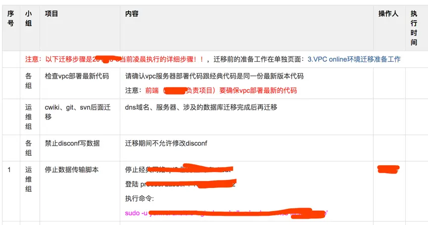 为了规避人工操作错误,我们在wiki制定了迁移过程所有人都必须遵循的操作步骤,如下