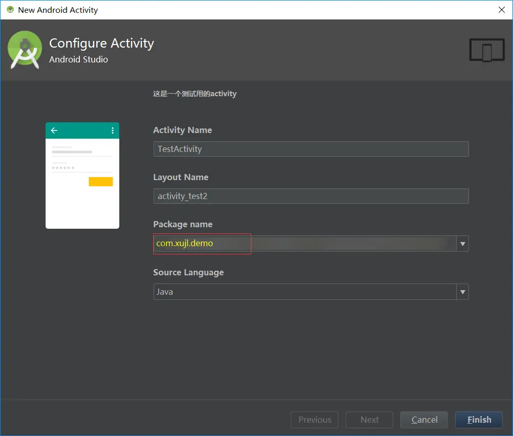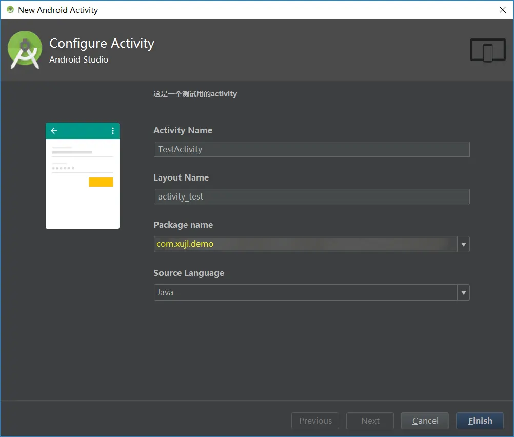 可以看到我们修改了模板介绍,修改了默认的activity名字,去掉了title和parent两个输入框,让我们点击完成试一下效果: