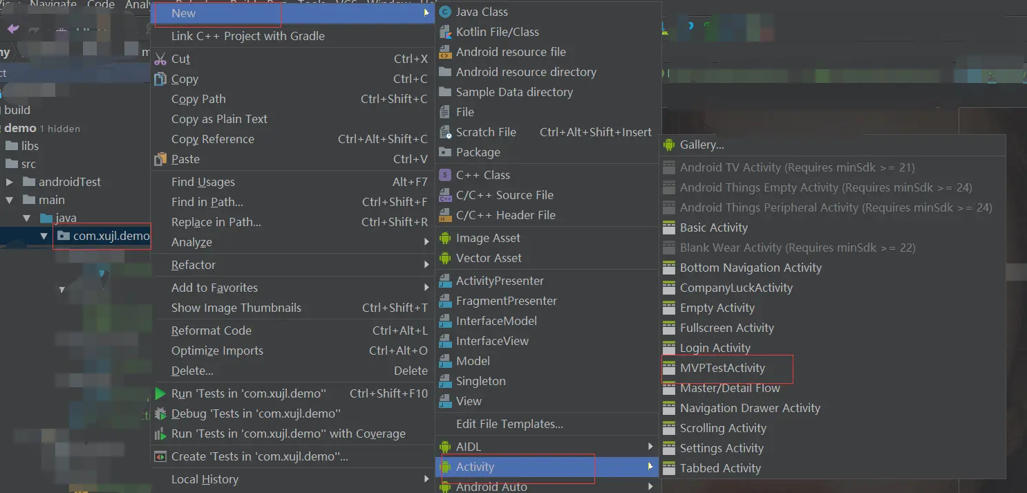 上面的模板功能虽然已经能够很方便的让我创建一个类而不用去写过多的重复代码了,但是依然不够好用,因为上面说了,mvp模式通常包含5个类,还有布局文件,还有activity注册代码,这些可以说是每次创建activity的必须代码,而如果仅仅使用上面的file template功能,依然需要多次在不同包下创建文件,还有没有更偷懒的方法呢?当然有,就是studio强大的activity模板功能了。