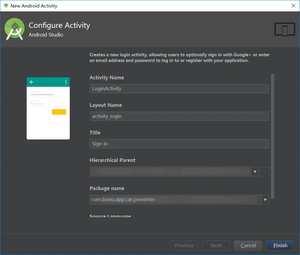 template.xml这个文件主要是用来定义我们的一些文件名和包名之类的变量属性,看看LoginActivity的配置界面效果,相信大家就懂这个文件的作用了: