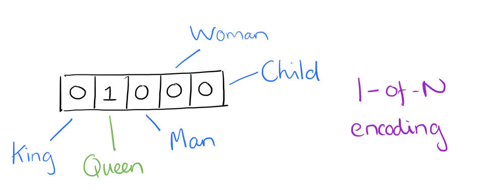 假设我们的词汇只有五个词:King, Queen, Man, Woman, 和 Child。 我们可以将单词“Queen”编码为: