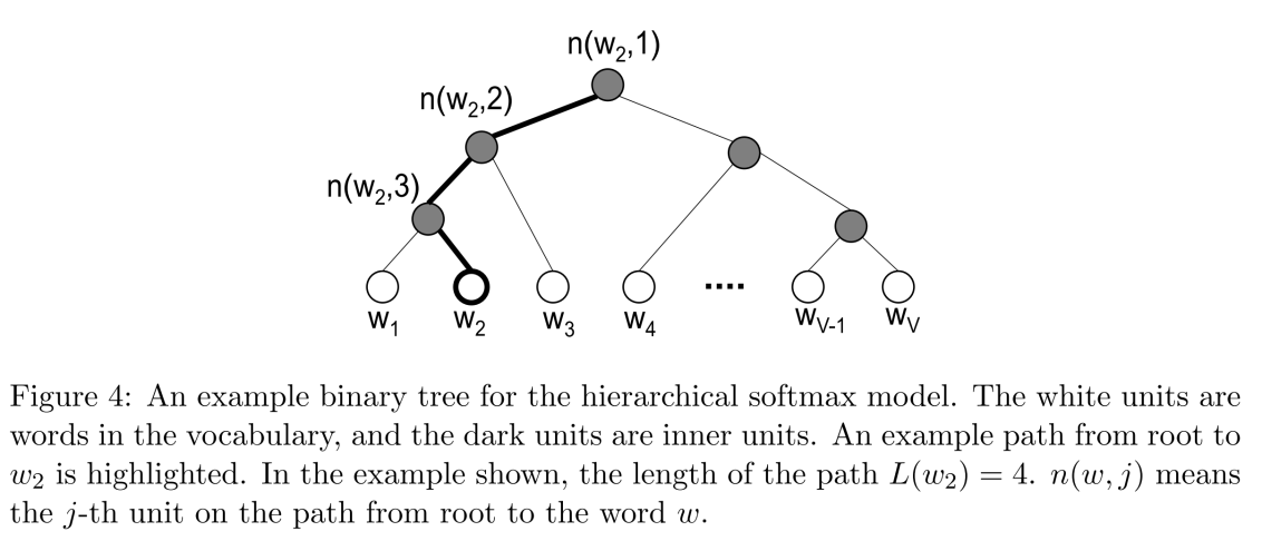 Hierarchical softmax 使用二叉树来表示词汇表中的所有词,每一个词在树中表示为叶子。对于每一个叶,从根到叶存在一个独特的路径,这条路径是用来估计由叶表示的单词的概率。“我们用从根到叶的随机游走的概率来定义这样的概率。”