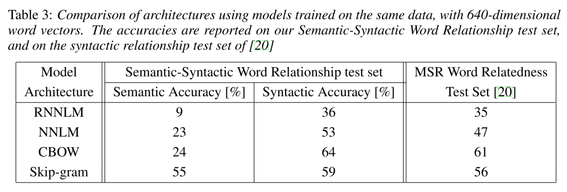 Mikolov等人并不是第一个使用词的向量表示形式的,但是他们确实减小了计算的复杂性,使在大量数据上学习高维词向量成为可行的。举个例子,“我们已经使用了谷歌新闻语料库进行训练的单词向量。该语料库包含6B词组。我们已经限制了词汇量的100万个最频繁的单词……”。