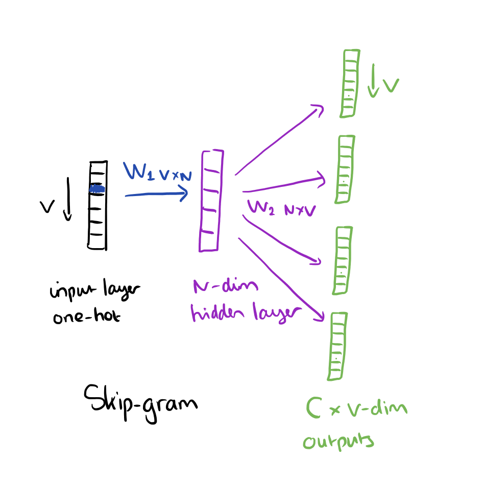 skip-gram和CBOW正好相反,它使用单一的聚焦词作为输入,目标上下文词作为输出,正如下图所示: