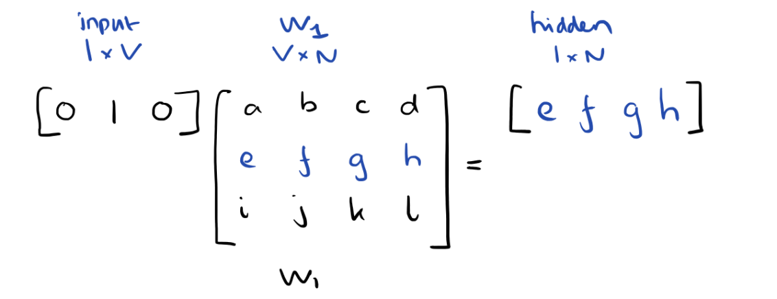 由于我们的输入向量都是一位有效编码的方式来表示,和权重矩阵W1相乘就相当于简单的选择一行。