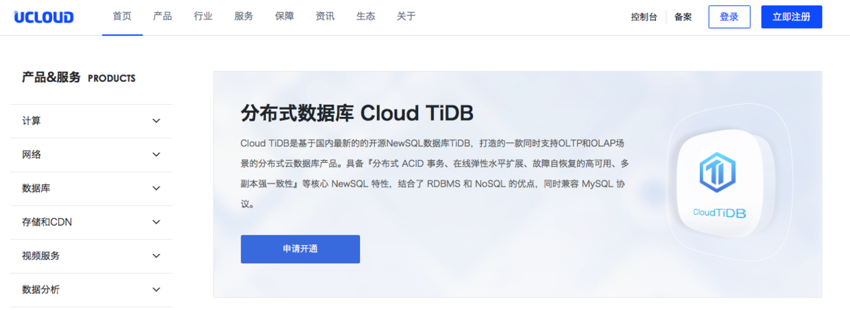 2017 年 10 月,国内领先的中立云计算厂商 UCloud 与国内开源分布式 NewSQL 数据库 TiDB 团队 PingCAP 正式达成合作,双方将联手在 UCloud 全球数据中心逐步推出新一代 TiDB 的云端版本——Cloud TiDB。
