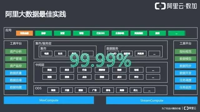 如图所示,MaxCompute是图上小人的“心脏”,所有运行的任务都在MaxCompute里面。调度是数据架构的“大脑”。“眼睛”是数据监控,目前在数据架构平台上它还是一个“近视眼”,还没有正式推出。数据集成就像两只“手”,不停地从其它地方搬运数据。底层的开发环境和运维中心就像两条“腿”,保证整个数据架构平台走得更远。而数据质量就像是一个“人体健康中心”,也就是数据质量的监控。