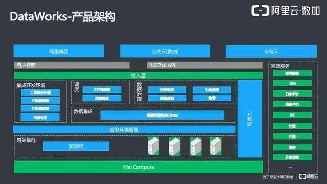 如上图所示,DataWorks主要依赖于MaxCompute。右边是阿里云目前提供的一些基础组件。集成开发环境这一块是可视化的,比如在工作流设计器上做工作流和应用调度,在里面进行配置。
