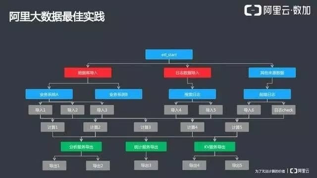 以阿里金融在后台大数据中的运行过程为例,我们会从关系数据库中把用户相关的所有数据全部导入到MaxCompute中,然后记录用户的一些操作日志,比如登录过哪些网站、浏览过哪些商品,有怎样的喜好。还有一些其它数据,可能是从其它系统过来的。我们把这些数据做一个汇总分析,最终把这些数据导出到业务系统中,也有一个统计服务。这样当用户来进行征信贷款的时候,我们很快就可以定位到这个用户是否符合征信要求,并迅速进行审批。