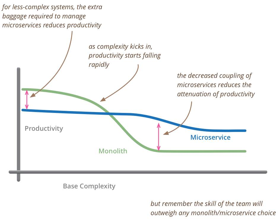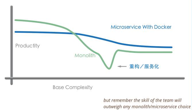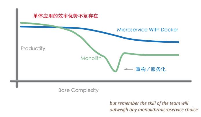 这张图很多人应该看到过,是 Martin Fowler 提出的关于微服务和单体应用的生产率趋势的比较。