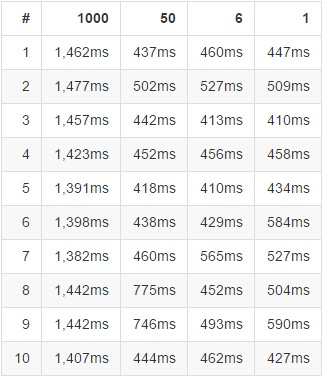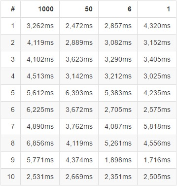后文的测试结果图表中,4 列代表 4 种不同的文件合并级别,每一行给出的数据分别是对 10 中不同的样本数据进行测试的结果(关闭了浏览器缓存),每次测试之间会有一段间隔时间。