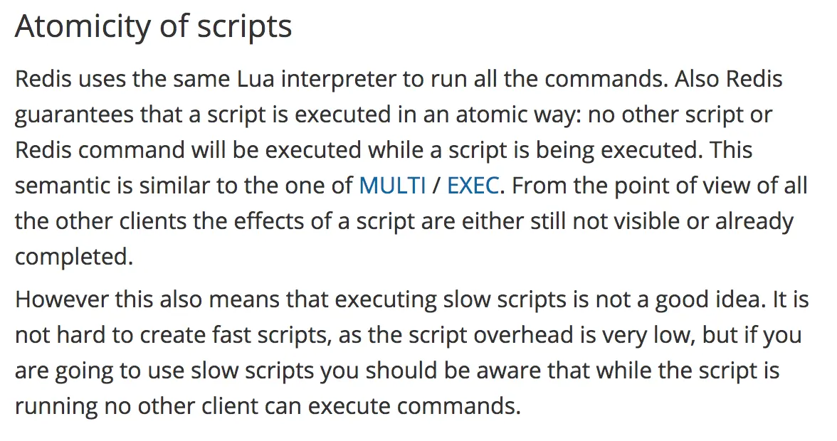 那么这段Lua代码的功能是什么呢?其实很简单,首先获取锁对应的value值,检查是否与requestId相等,如果相等则删除锁(解锁)。那么为什么要使用Lua语言来实现呢?因为要确保上述操作是原子性的。关于非原子性会带来什么问题,可以阅读【解锁代码-错误示例2】 。那么为什么执行eval()方法可以确保原子性,源于Redis的特性,下面是官网对eval命令的部分解释: