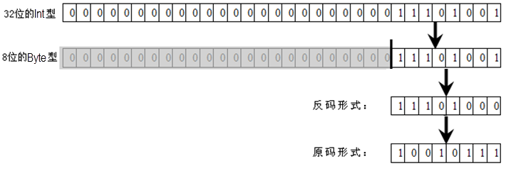 从图3.11可以看出,32位Int类型的233在内存中如图2.3上面所示,强制类型转换为8位的Byte类型,则需要截断前面的24位,只保留右边8位,最左边的1是符号位,此处表明这是一个负数,负数在计算机里是以补码形式存在的,因此还需要换算成原码。