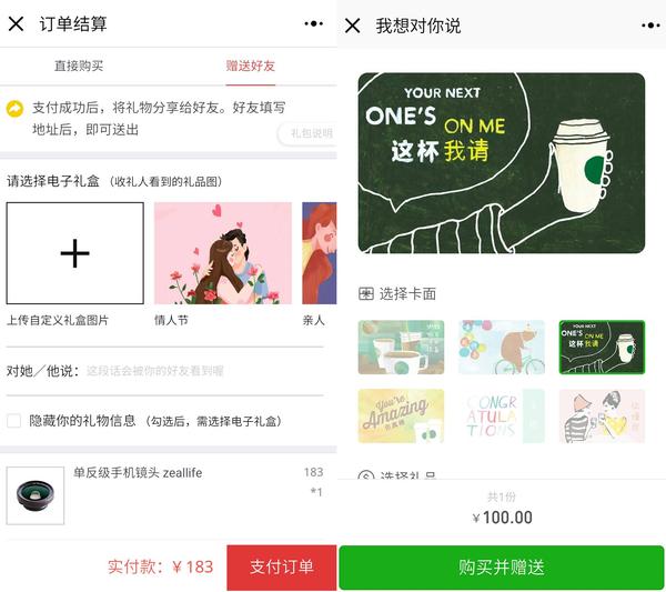 商品赠送和礼品卡都是通过一送一得的传播方式成倍拓展用户,主要的玩法有玩物志的实物赠送,和星巴克用心说的卡卷赠送。