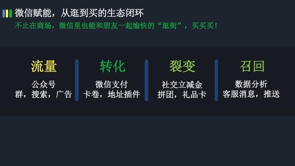 如果想在这片蓝海中脱颖而出,一定要紧跟微信抛出的新功能,高速迭代和开发平台中崭新的玩法。让电商平台负责吸引更多的新客到访,让商家自己去争取留存和复购。