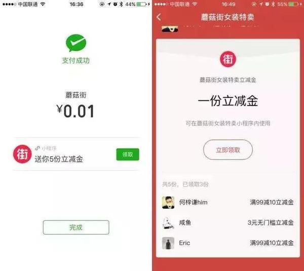 在小程序内完成购物后,可以获得社交立减金,社交立减金可以列变成多份,用户可以把社交立减金分享给好友,好友收到立减金后可以在小程序内直接落地购买,达到流量的裂变。