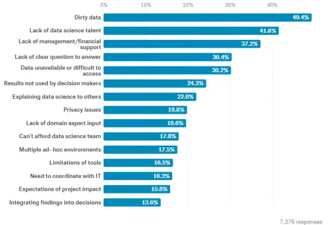 脏数据(Dirty Data)是最大障碍。机器有侧重,但理解不同算法的能力不够也是一大困扰数据工作者的障碍。缺乏有效管理和资金支持是数据工作者面临的两大外在困境。