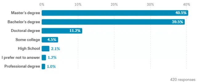 而美国,硕士学位只有44.5%,博士学位高达20.7%,本科从业者占比也高达26.5%。