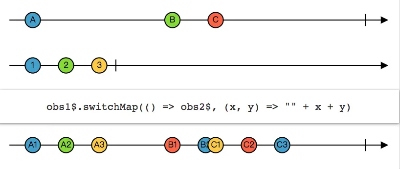 switchMap转换操作符,也与flatMap()相似,每当源Observable发射新数据项(Observable)时,它将取消订阅并停止监视之前那个数据项产生Observable,并开始监视当前发射的这一个。