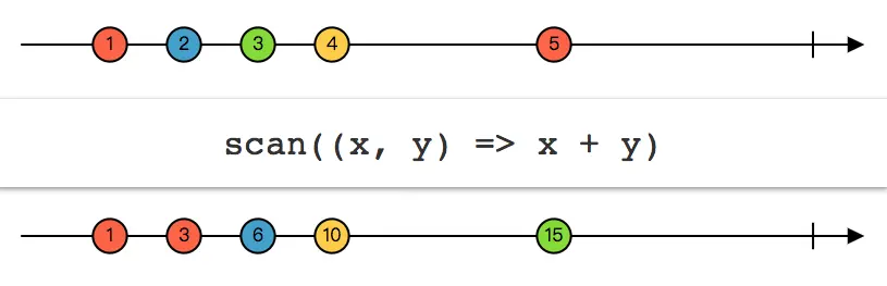 scan操作符,对一个序列的数据应用一个函数,并将这个函数的结果发射出去作为下个数据应用函数时的第一个参数使用。