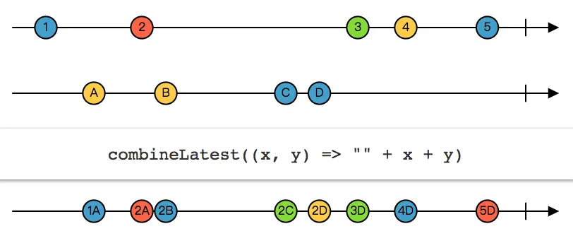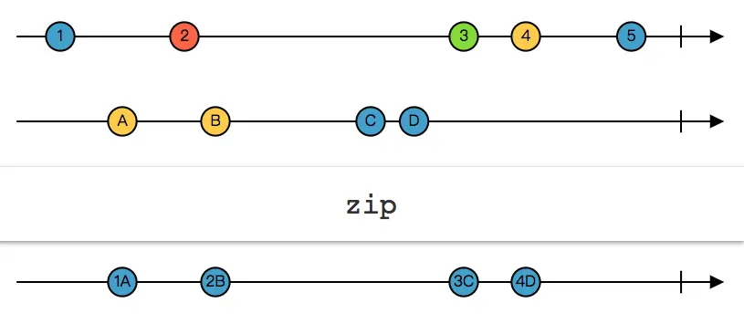 - Func2:接收从源Observable和目标Observable发射出来的数据,并将这两个数据按自定的规则组合后返回。