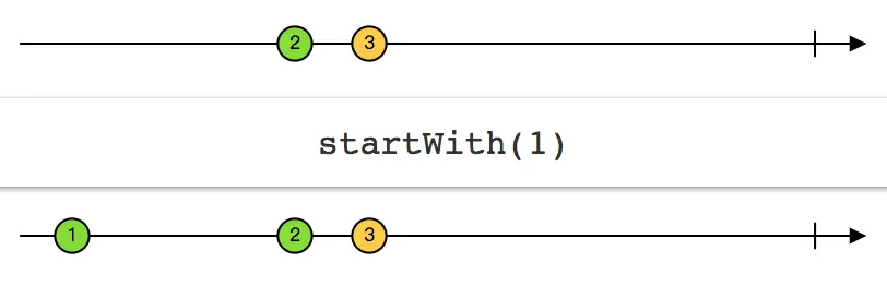 startWith操作符,用于在源Observable发射的数据前,插入指定的数据并发射。