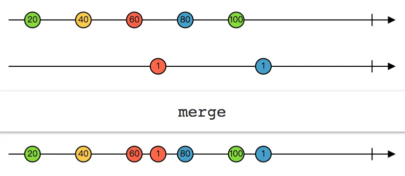merge操作符,将两个Observable要发射的观测序列合并为一个序列进行发射。按照两个序列每个元素的发射时间先后进行排序,同一时间点发射的元素则是无序的。