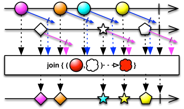 join操作符的组合方式类似于数学上的排列组合规则,以ObservableA为基准源Observable,按照其自身周期发射数据,且每个发射出来的数据都有其有效期。而ObservableB每发射出来一个数据,都与A发射出来的并且还在有效期内的数据按Func2函数中的规则进行组合,B发射出来的数据也有其有效期。最后再将结果发射给观察者进行处理。//产生字母的序列,周期为1000ms String[] words = new String[]{"A", "B", "C", "D", "E", "F", "G", "H"}; Observable<String> observableA = Observable.interval(1000, TimeUnit.MILLISECONDS) .map(new Func1<Long, String>() { @Override public String call(Long aLong) { return words[aLong.intValue()]; } }).take(8); //产0,1,2,3,4,5,6,7的序列,延时500ms发射,周期为1000ms Observable<Long> observableB = Observable.interval(500, 1000, TimeUnit.MILLISECONDS) .map(new Func1<Long, Long>() { @Override public Long call(Long aLong) { return aLong; } }).take(words.length); //join observableA.join(observableB, new Func1<String, Observable<Long>>() { @Override public Observable<Long> call(String s) { //ObservableA发射的数据有效期为600ms return Observable.timer(600, TimeUnit.MILLISECONDS); } }, new Func1<Long, Observable<Long>>() { @Override public Observable<Long> call(Long aLong) { //ObservableB发射的数据有效期为600ms return Observable.timer(600, TimeUnit.MILLISECONDS); } }, new Func2<String, Long, String>() { @Override public String call(String s, Long aLong) { return s + aLong; } } ).subscribe(new Action1<String>() { @Override public void call(String s) { Log.e("rx_test", "join:" + s); } });
