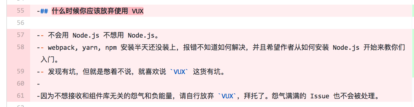 这样的问题不仅仅发生在 iView 上,我同 VUX(知名移动端 Vue 组件库) 的作者也深刻探讨过,在 VUX 的社区也会带有不少类似的负能量。这种不良现象在国内应该还有很多,VUX 的 readme 曾今写的这段仅有的中文,正是写给这部分人看的: