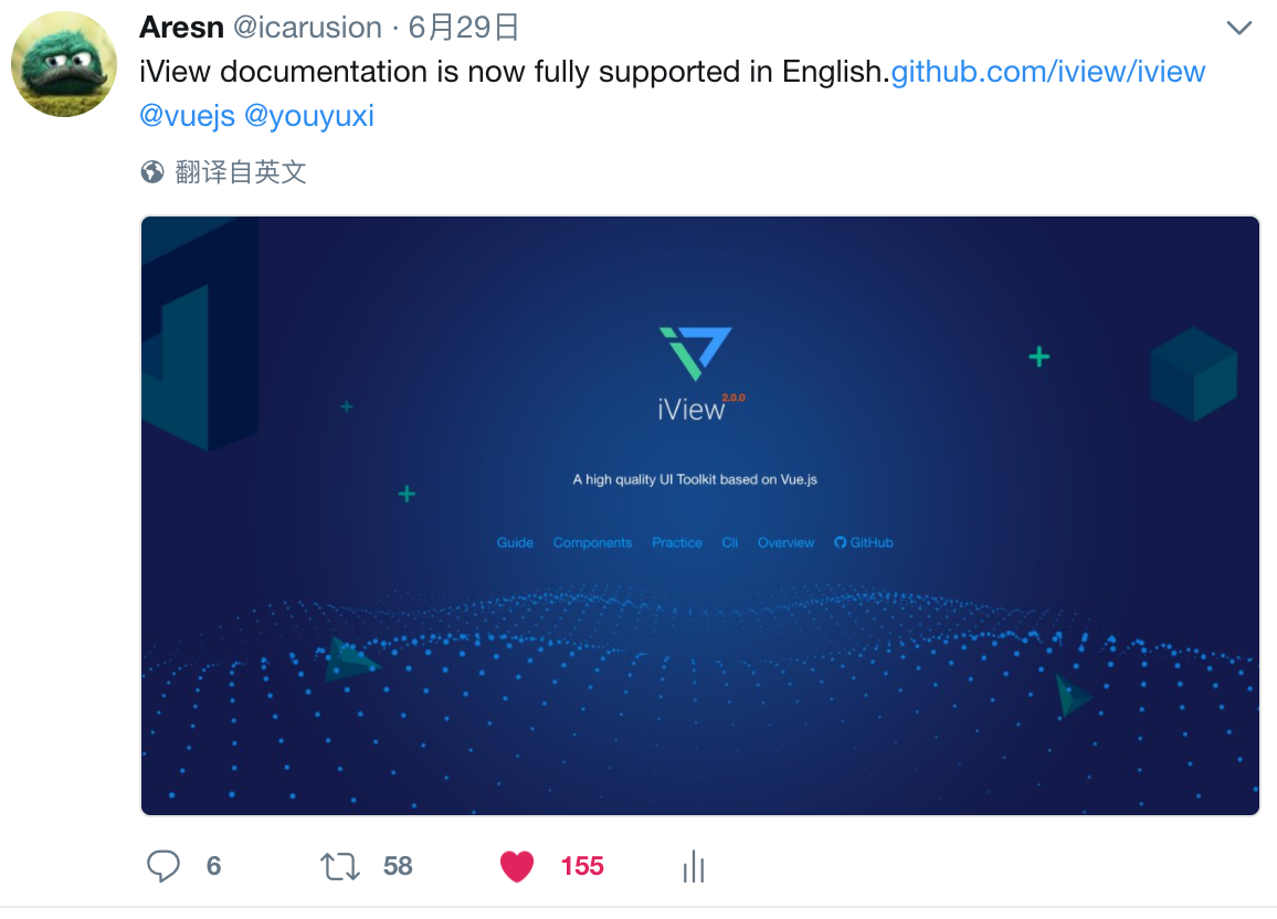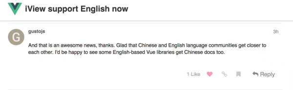 上个月,我们已将 iView 文档全部翻译为英文,前前后后进行了 3 个多月才算完成。有了英文版后,更多的国外开发者也参与到 GitHub 讨论之中,相信接下来会有更多来自国外的 contributors。