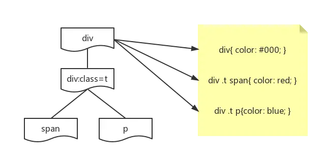 此处会有 4*3 个匹配项,如果做正向匹配,在遇到 <span> 标签匹配 div .t p{ color: red; } 到匹配项时,计算机首先要找到<span> 标签的父标签和祖父标签,判断他们是否满足div .t的规则,然后再匹配<span>是否为p标签,此处匹配不成功,产生了三次浪费。