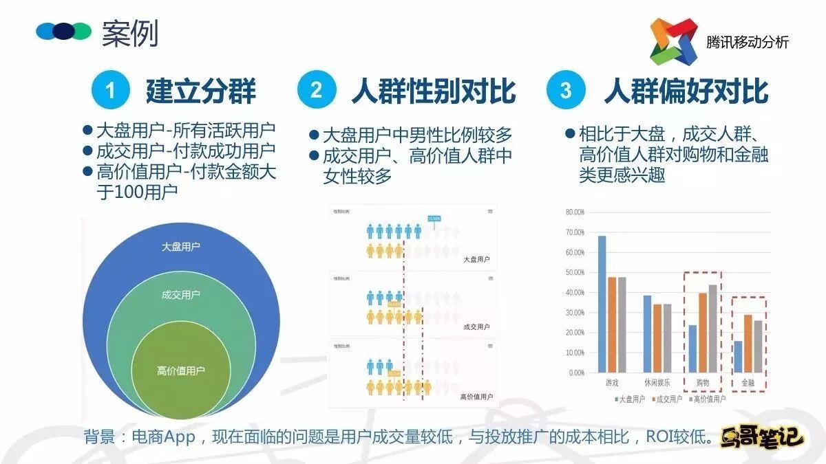 第二是用户人群分析,需要对用户分群,并确立不同群体的特征,到了成熟期,需要针对不同用户做差异化用户策略,才能达到最优效果;