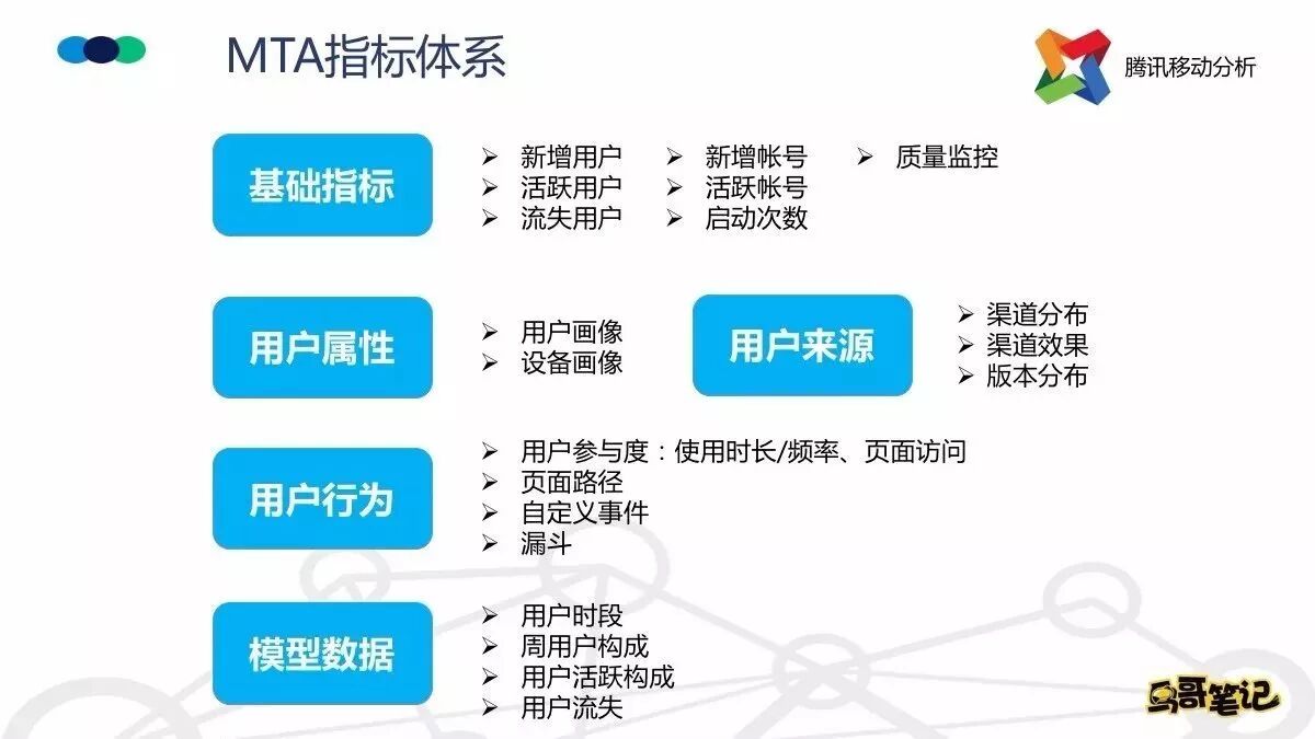 基础数据统计是日常业务相关的,比如新增活跃、新增次数流程等一些基础数据;用户属性统计包含两个方面——社会属性和设备属性,前者即我们常说的性别、年龄、学历等,后者则是一些机型、操作系统、联网方式这些;用户来源统计就是一些渠道,还有版本;用户行为统计很重要,因为它可以反映用户使用产品的路径、行为习惯,然后根据用户的特征来刻画用户画像,甚至可以做产品迭代。