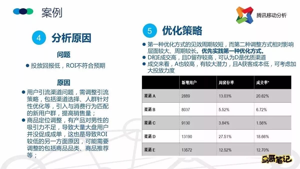 所以优先选择比较快的第一种优化方式,然后看整个渠道的数据。一共五个渠道,渠道 A、D、E 的成交率都比较高,其中渠道 D 的留存率是27.51%,可以认为渠道 D 是一个优质渠道,渠道 E 也算是一个成交率较好渠道。渠道 A 的成交率很高,但新增用户量很低,这个要多考虑。